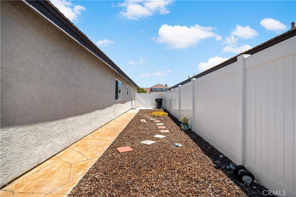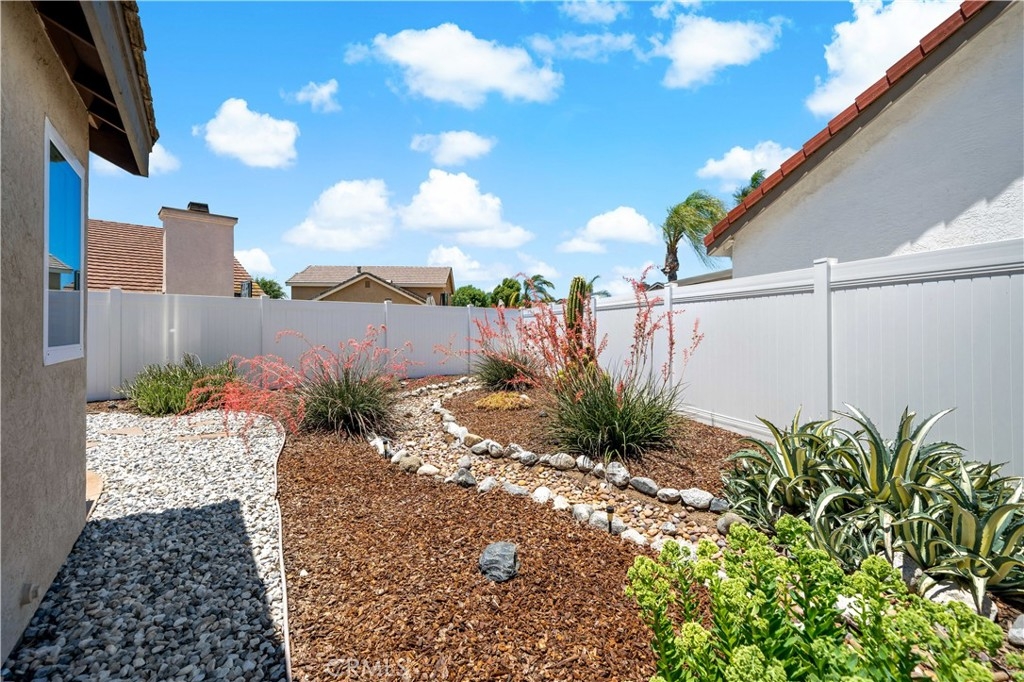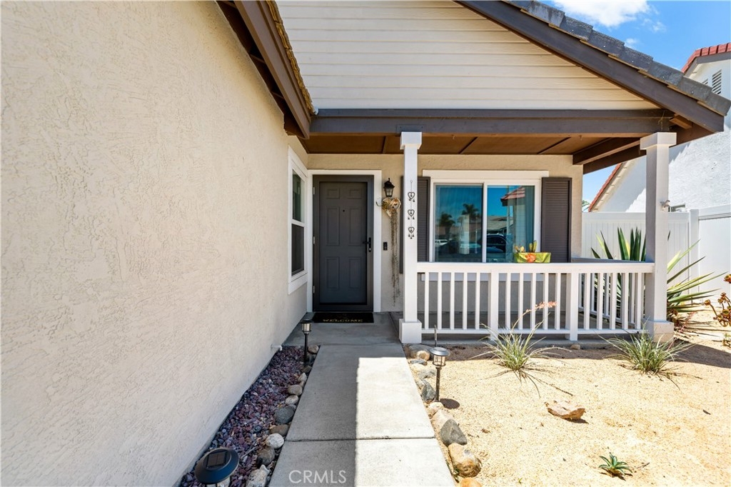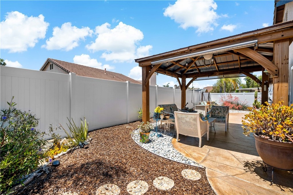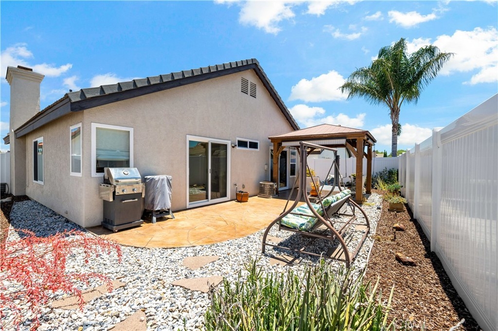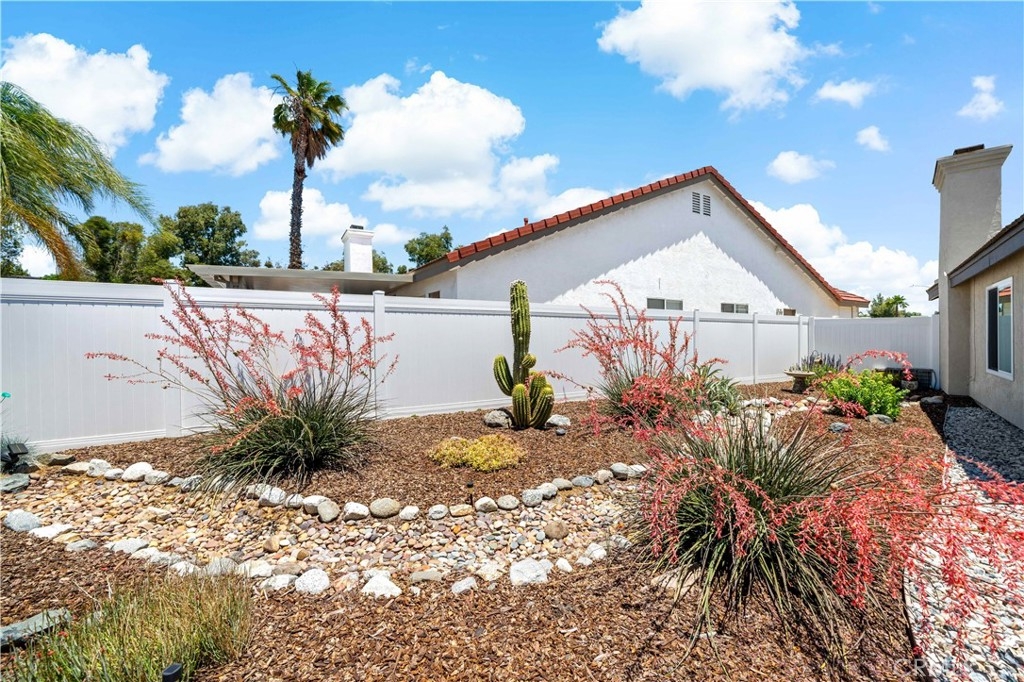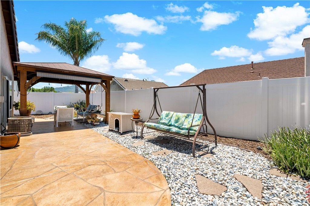 Welcome to this charming single-story home located in South Temecula. This property boasts numerous upgrades that are sure to impress. As you enter, you will immediately notice the Vista security door, providing both security and style. The home also features all-new windows and new patio sliding doors, allowing for ample natural light to flow throughout. Living area showcases beautiful hardwood flooring, creating a warm atmosphere. Cozy fireplace has been updated, becoming a focal point in the living area. Ceiling fans have been installed throughout the home, promoting airflow and comfort. Kitchen is a true highlight, featuring an acid stain epoxy floor and elegant quartz countertops The bedrooms have been updated with plush new carpeting. All bathroom vanities have been replaced, and the master bathroom boasts a luxurious tile walk-in shower plus a barn door that adds a touch of charm. The master bathroom also features luxurious LVP flooring. Closet organizers provide added convenience. Upgraded baseboards and a decorative wood wall in the master bedroom add a touch of elegance. The fire alarms have been updated for safety, and the vents have been upgraded for improved efficiency. The garage floor has been coated with epoxy, giving it a polished and sleek look Step outside onto the concrete overlay patio, perfect for outdoor entertaining with a delightful gazebo with lights and roll-down shades, creating the perfect space to relax and unwind. The backyard is low-maintenance, with drought-tolerant landscaping. The property is enclosed by new vinyl fencing, ensuring privacy and security. Don't miss the opportunity to own this beautifully upgraded single-story home in Temecula.